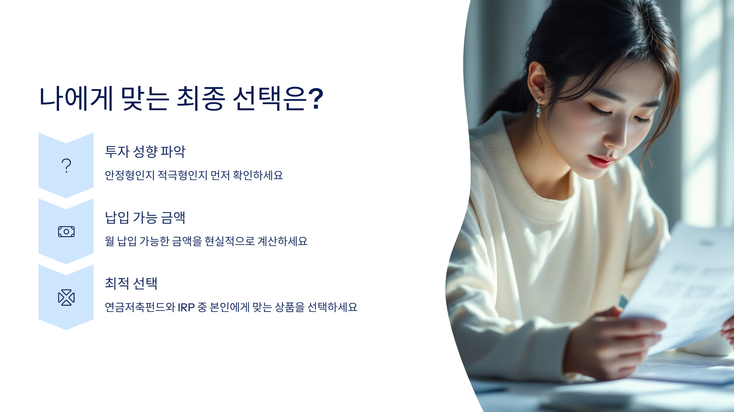 '나는 소득이 없는 학생이나 주부다', 또는 '나는 20~30대로, 은퇴까지 30년 이상 남아있어 공격적인 투자를 하고 싶다'면 연금저축펀드가 더 나은 선택입니다. 반면, '나는 연 900만원까지 세액공제 혜택을 최대로 받고 싶다', '퇴직금을 수령하여 운용해야 한다'면 IRP가 필수적입니다. 또한, 안정적인 투자를 선호하여 예금 상품을 담고 싶다면 IRP가 유일한 선택지입니다.
