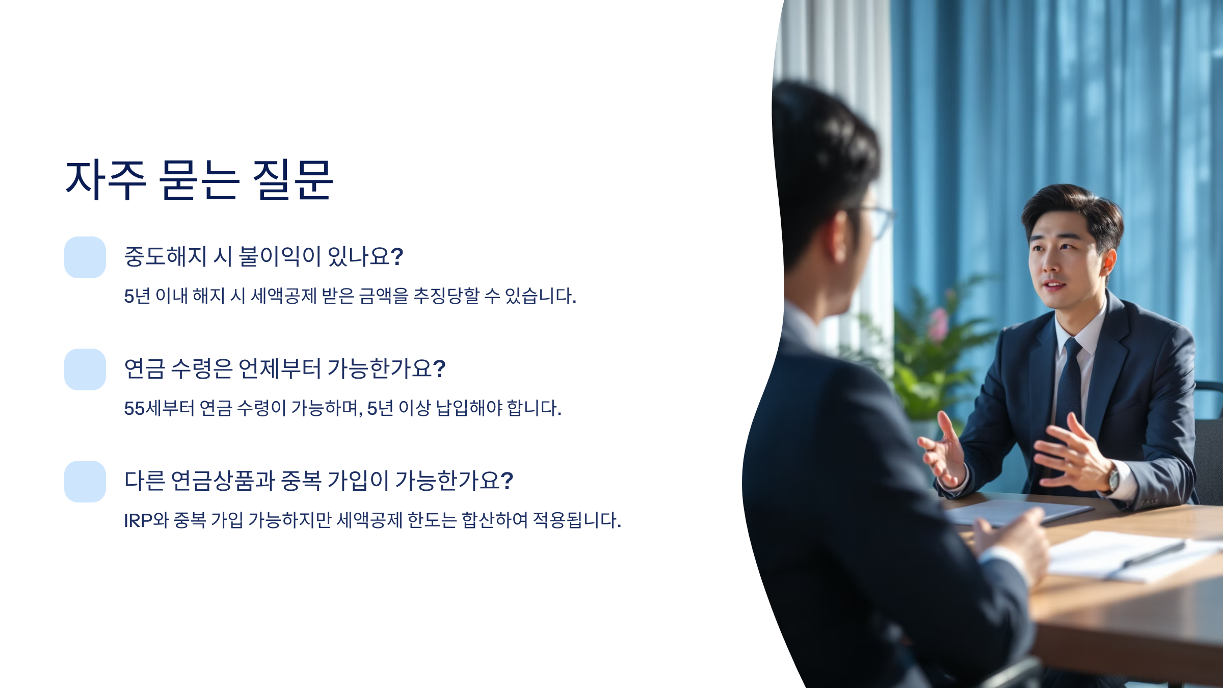 IRP와 마찬가지로, 연금 수령 목적 외에 임의로 중도 해지할 경우 세제 혜택을 모두 반납해야 합니다. 그동안 세액공제를 받은 납입 원금과 운용 수익 전체에 대해 16.5%의 높은 기타소득세가 부과됩니다. 이는 연금 유지를 위한 강력한 페널티이므로, 연금 계좌에는 반드시 장기적으로 묶어둘 수 있는 여유 자금만 납입해야 합니다.