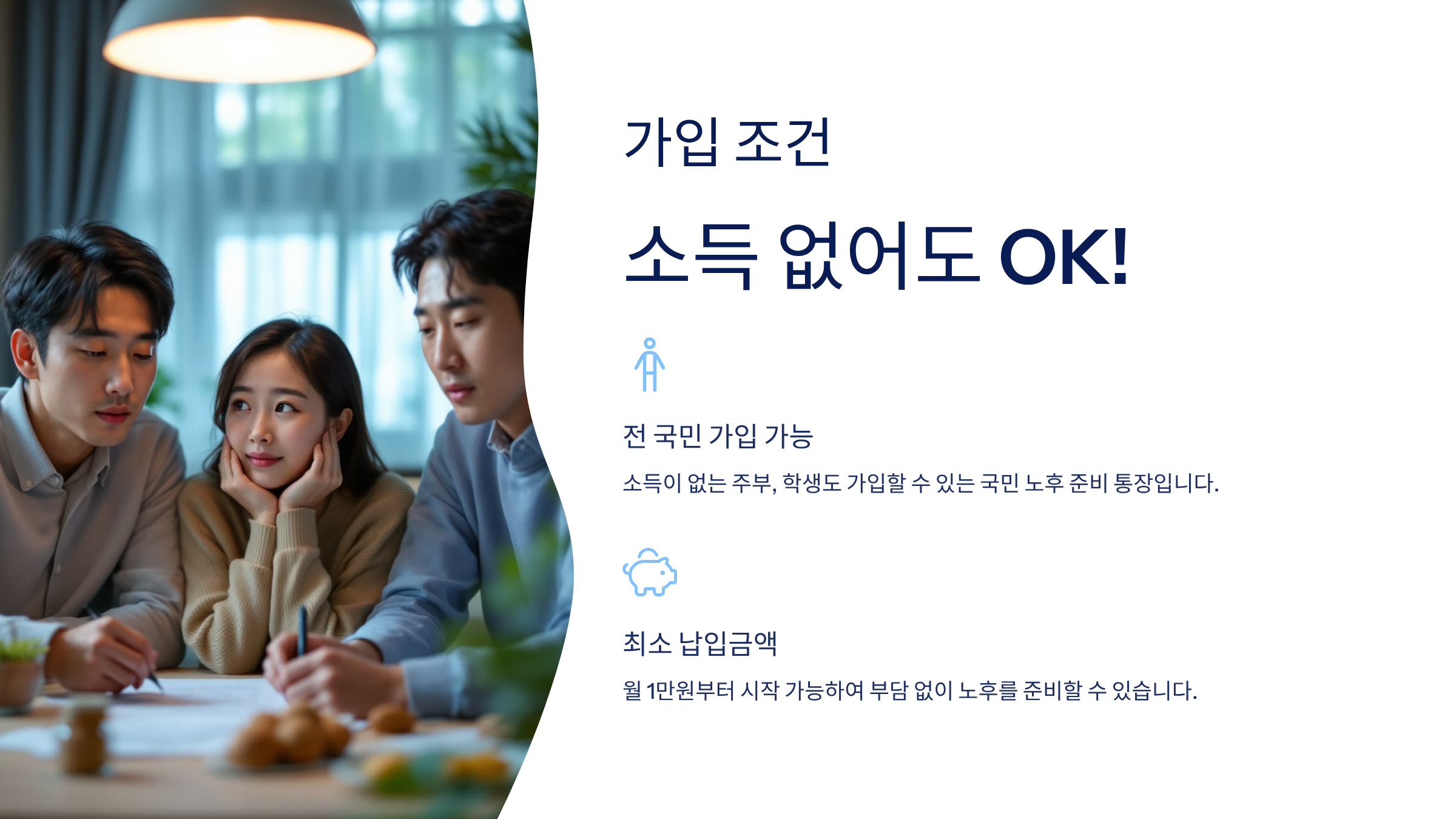 👤 2. 가입 조건: 소득 없어도 OK, 전 국민의 노후 준비 통장