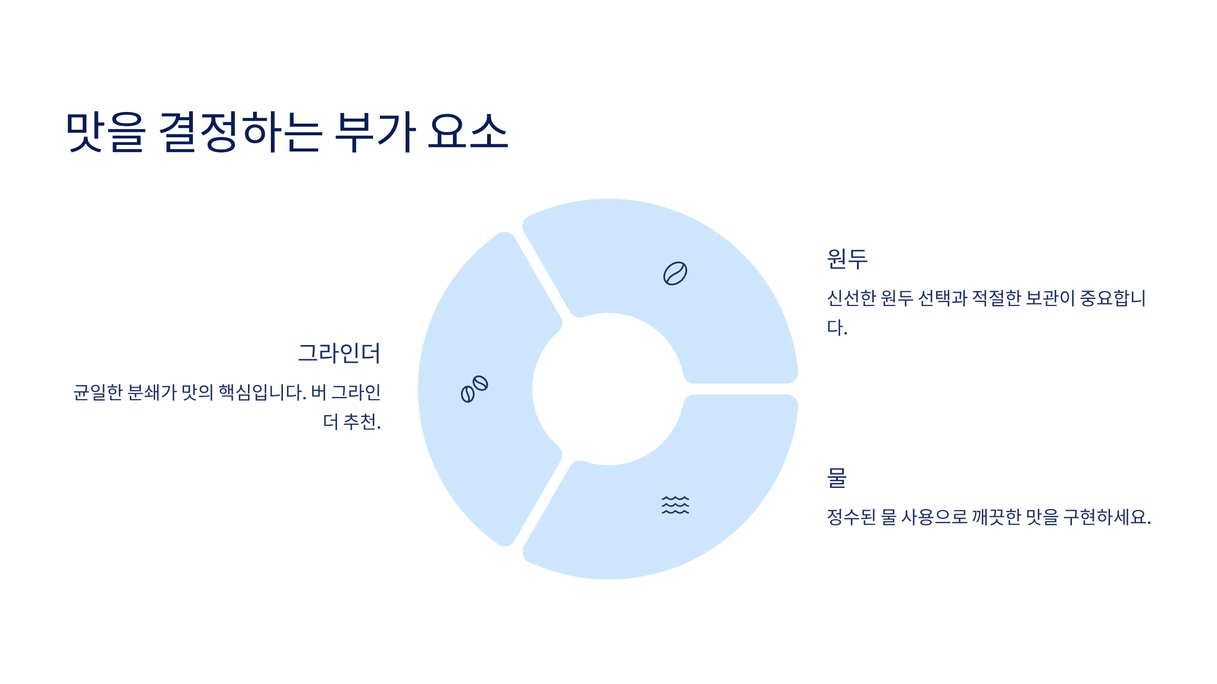 최고급 에스프레소 머신을 샀다고 해서 무조건 맛있는 커피가 나오는 것은 아닙니다. 커피의 맛은 머신만큼이나 '원두', '그라인더', '물'이라는 3가지 요소에 의해 크게 좌우되기 때문입니다. 특히 반자동 머신을 선택했다면, 좋은 '그라인더'에 투자하는 것은 선택이 아닌 필수입니다. 미리 분쇄된 원두는 향이 금방 날아가고, 굵기가 균일하지 않아 안정적인 추출을 방해합니다.