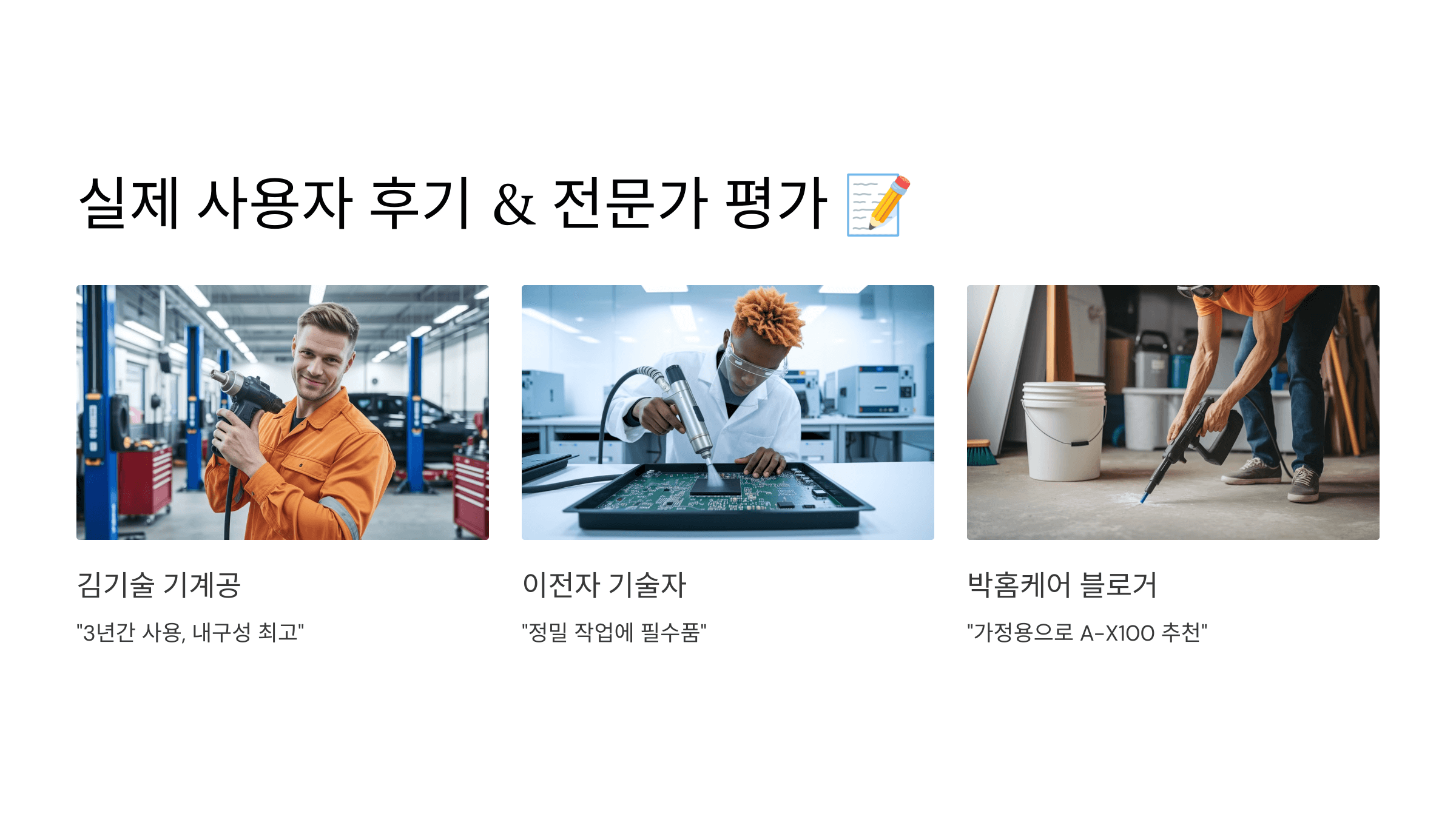 - 자동차 정비 전문가 – "엔진룸이나 필터 청소에는 적절한 압력 조절이 가능한 에어건이 필수다."