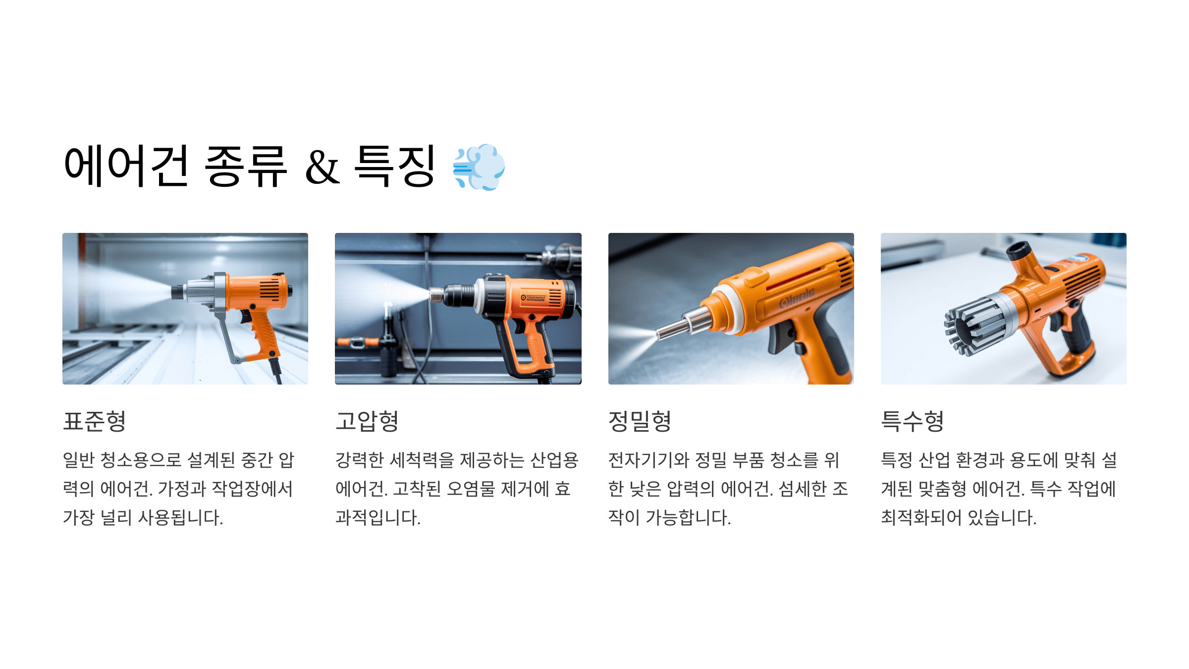 | 일반형 에어건 | 기본적인 먼지 제거 및 공기 분사 | 가정용, 자동차 청소 |